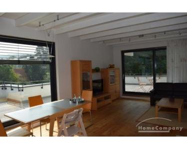 Vom gemütlich eingerichteten Wohn/Ess-Zimmerbereich mit Kamin, hat man den direkten Zugang auf die große teils überdachte Dachterrasse (ca.100m2).