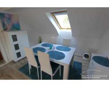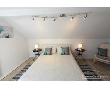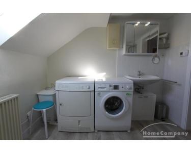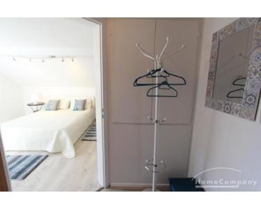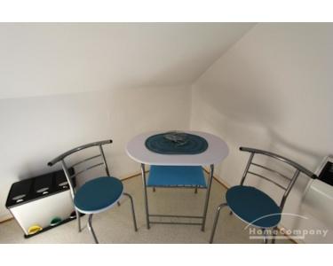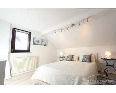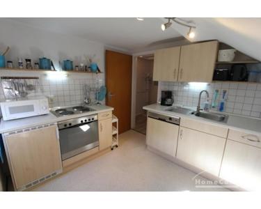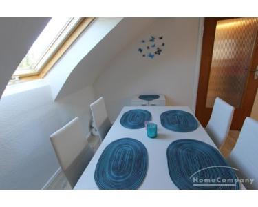 Die helle Dachgeschoss-Wohnung besteht aus einem Wohnzimmer mit gemütlichen Sitzgelegenheiten und einem Esstisch für 4 Personen, einem Schlafzimmer mit 160er Bett (unter dem Bett befinden sich große Bettkästen), einer voll ausgestatteten Einbauküche u. a. mit Spülmaschine, Toaster, Eierkocher, elektrischer Saftpresse, einem kleinem Bürozimmer mit Schreibtisch, dem Eingangsbereich mit ausreichend Staufläche durch zwei Schränke und einem weiß gefliesten Tageslichtduschbad mit Waschmaschine und Trockner.
