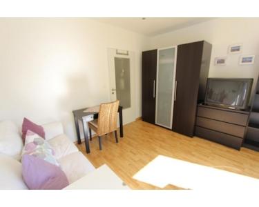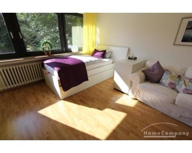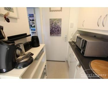 Perfekt für Pendler: kleines Appartement in einem Mehrfamilienhaus gelegen, Wohn-Schlafraum mit Blick in den Garten, zeitlose Möblierung, kleine Küchenzeile im Eingangsbereich.