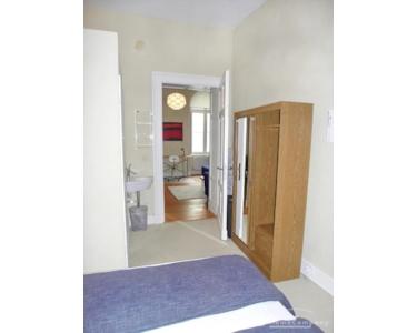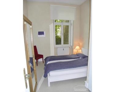 Das separate Schlafzimmer mit Duschbad und 140er Bett liegt sehr ruhig zum Garten.