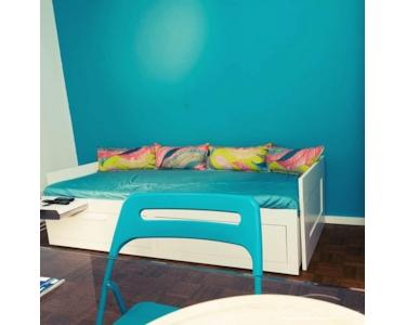 - Einen gemütlichen Wohn-/Schlaf-/Arbeitsraum mit einem Bett zum Ausziehen, einer Sitzmöglichkeit zum Essen/Arbeiten und einem gemütlichen Sessel. Ein begehbarer Kleiderschrank mit Regalen, Kleideraufhängung und diverse Regale bieten ausreichend Stauraum.