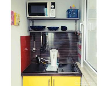 - Eine separate kleine Küche mit Küchenzeile (Kühlschrank, Ceranfeld, Mikrowelle, Wasserkocher) und Ablagemöglichkeit. Etwas abgetrennt davon befindet sich eine Küchentheke für Geschirr und Kühlschrank.