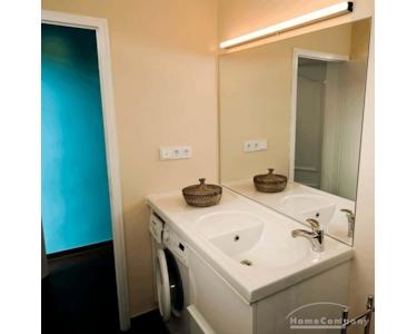- Ein neues Bad mit Duschwanne und großem Waschbeckenunterschrank, in dem die Waschmaschine verstaut ist.