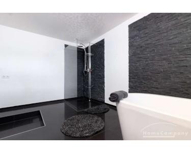 Das Badezimmer ist modern und elegant eingerichtet und verfügt über eine Badewanne und eine begehbare Dusche.