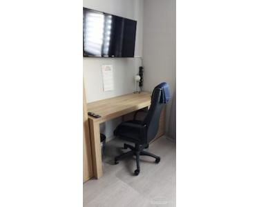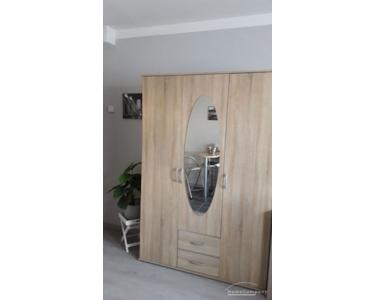 Ein großer Wohn-Schlafraum, der mit einem 140er Bett, einem schönen Holzkleiderschrank, TV-Gerät, angrenzender Pantryküche und einem praktischen Tresen ausgestattet ist.
