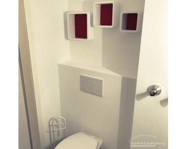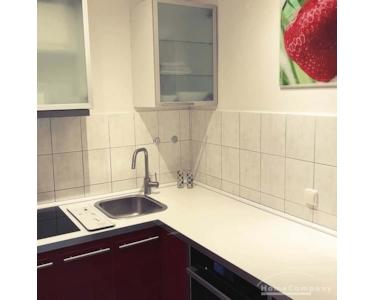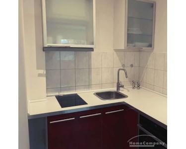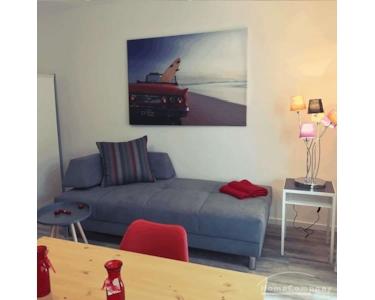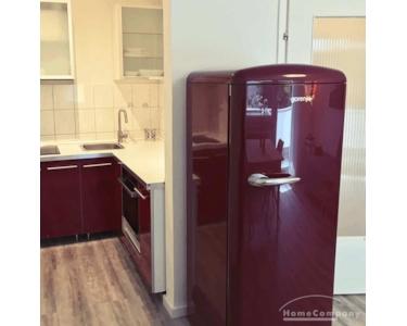 Moderne Einbauküche mit dunkelroten Türen, einem Ceranfeld, Kühlschrank und Backofen. Wohn-/Schlaf-/Arbeitsraum mit Sitzmöglichkeit zum zum Essen und Arbeiten sowie Schlafsofa, Beistelltisch, Vintage-Kleiderschrank, Jugendstil Vertiko, Sessel mit Fußhocker. Neues hell gestaltetes Bad mit Duschwanne. Flur mit Vintage Garderobe. Böden mit Laminat, Fliesen. Internetzugang vorhanden.