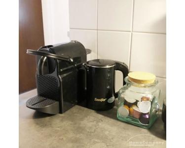 Die Wohnküche ist mit einer neuen Einbauküche ausgestattet. Diese bietet neben dem Üblichen (Backofen und Herd mit Dunstabzug, Spüle, Kühlschrank) auch eine Waschmaschine. Die Küche ist umfangreich bestückt, inklusive Nespresso Maschine, Wasserkocher, Koch- und Essgeschirr. Ein ausziehbarer Esstisch sorgt für Flexibilität: Ausgezogen bietet er für 4-6 Personen Platz, eingeklappt macht er sich schlank für 2-3 Personen. Auch ein geräumiger Kleiderschrank findet hier Platz.