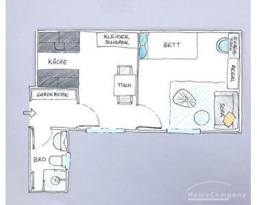 Das top gepflegte und stylisch möblierte 1-Zimmer-Apartment liegt in einer kleinen Wohnstraße im 2. Obergeschoss zum ruhigen Innenhof.