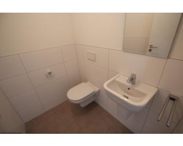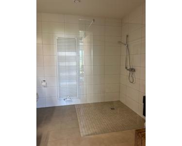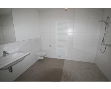 - Sanitäre Einrichtungsgegenstände in weiß (Waschtischanlage, Duschplatz und WC)