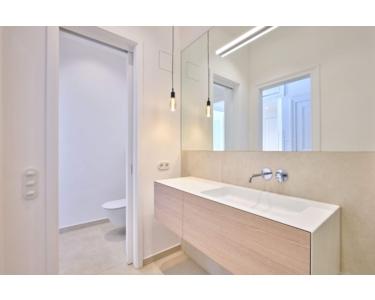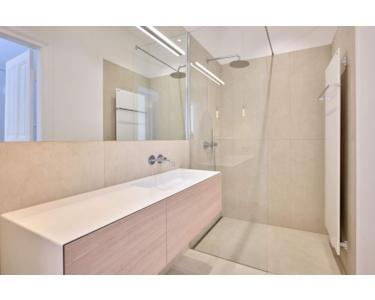 Die Gestaltung der Bäder unterstreicht den feinen Stil der Eigentumswohnungen durch klare Formen und hochwertige Materialien namhafter Markenhersteller. Bei der Auswahl der Produkte steht die Balance zwischen Funktionalität und Komfort sowie ein zeitlos elegantes Design im Vordergrund. Verchromte Bad-Armaturen von Herzbach, der hochwertige Waschtisch von Alape mit zwei Auszügen, der große Wandspiegel mit der Designer-Spiegelleuchte von Ribag und der Wandheizkörper von Zehnder ”Fina LenaBar”, der natürlich auch als Handtuchhalter dient, verleihen dem Bad eine einladende Wellness-Atmosphäre.