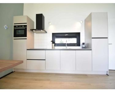 Schöne moderne Küche in einer aufrechten Anordnung. Dieser Queue enthält einen Quooker für heißes Wasser. Außerdem ist diese Küche komplett ausgestattet. Schwarze Dunstabzugshaube, Kühlschrank mit Gefrierfach, Induktionskochfeld und Geschirrspüler.
