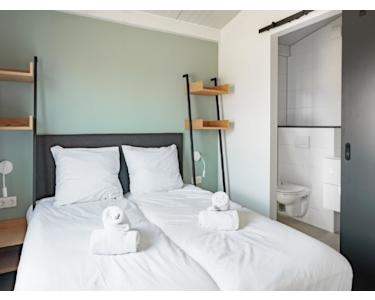Schlafzimmer 2 hat ebenfalls ein eigenes Bad und auch hier gibt es ein Doppelbett. Großes Fenster für frische Luft.