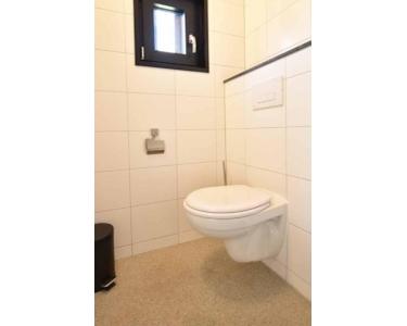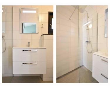 Badezimmer mit Badezimmerschrank zur Aufbewahrung von Toilettenartikeln. Spiegel mit eingebauter Beleuchtung. Begehbare Dusche und eine hängende Toilette.