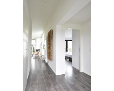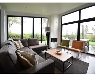 Das große Wohnzimmer mit riesigen Glasfenstern bietet viel Licht und Zugang zur Terrasse. Die Decke ist mit Strahlern versehen. Eine weitere Besonderheit dieses Hauses ist der Kamin, der nicht in allen Häusern zu finden ist, aber in den Wintermonaten sehr gemütlich ist.