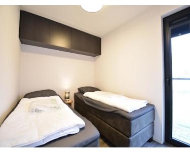 Schlafzimmer 3 enthält 2 einzelne Boxspringbetten, und um den Platz optimal zu nutzen, ist der Kleiderschrank über den Kopfenden der Betten angebracht.