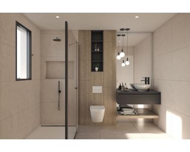 - komplett ausgestatteten Bädern mit Waschtisch, Hängetoilette, Spiegel, Wanddusche, Duschabtrennung und Fußbodenheizung