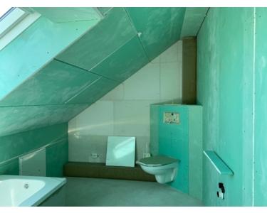 . das Badezimmer im Dachstudio (mit Wanne und WC) ist vorbereitet; Maler,- Spachtel und Fliesenarbeiten