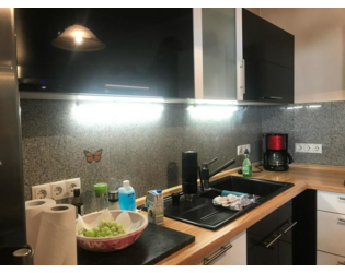 In dem Haus ist eine offen gestaltete Einbauküche vorhanden. Das Bad des Hauses verfügt über eine Badewanne und eine Dusche.