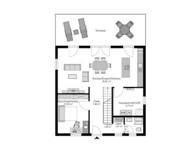 Der Hausentwurf bietet in der Architektur die moderne Interpretation einer 2-geschossigen Stadtvilla mit Walmdach. Auf 146 m² Raumfläche lässt sich eine komfortable Wohnsituation realisieren. An der Südseite sind sechs bodentiefe Fenster-/Terrassentürelemente geplant, die viel Licht ins Haus bringen. Mit knapp 37 m² ist der offene Wohn-/Ess- und Kochbereich angelegt. Die Küche kann mit einer Kochtheke geplant werden. Ein Zusatzraum im Erdgeschoss kann als Gäste-/Büro- oder Schlafzimmer genutzt werden. Ein Bad mit einer optionalen Dusche, eine Diele mit Garderobennische und ein Haustechnikraum komplettieren das Erdgeschoss.