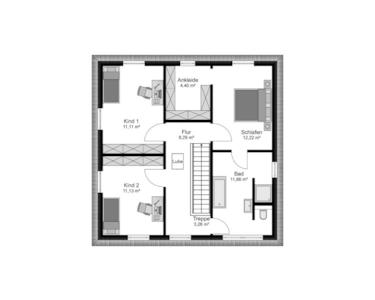 Im Obergeschoss der Stadtvilla sind zwei schöne Kinderzimmer geplant, ein Elternbereich mit Ankleide und ein geräumiges Familienbad. Die Lage der Treppe und des Haustechnikraumes sind beim Frühlingszauberangebot fixiert.