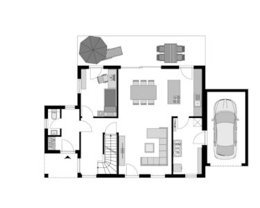 Das Architektenhaus Bad Vilbel überzeugt mit einem außergewöhnlichen Grundriss. Durch die weiße Putzfassade kommen die anthrazitfarbenen Fensterrahmen gut zur Geltung und geben dem Haus in Kombination mit Holzlisenen am Giebel und einem Balkongeländer aus Glas einen modernen und frischen Charakter. Im Erdgeschoss wird der große Wohn-/Essbereich durch die Erkerausbildung geprägt. Die Küche ist separat, aber dennoch offen angelegt. Das bietet den Vorteil, dass für Gäste und Besucher der Küchenbereich nicht unmittelbar einsehbar ist. Neben der Küche ist der praktische Hauswirtschafts- und Technikraum angelegt. Die Terrasse ist durch einen Gebäudeversatz teilweise überdacht. Viele bodentiefe Fensterelemente im Erdgeschoss lassen außerordentlich viel Licht ins Haus. Ein Arbeits-/Gästezimmer, eine geräumige Diele und ein Gäste-WC sind ebenfalls im Erdgeschoss untergebracht.