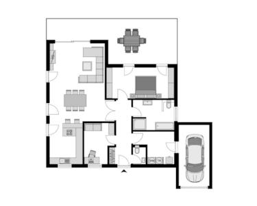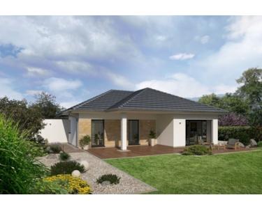 Der elegante Hausentwurf des Winkelbungalows mit Walmdach, überdachter Terrasse und Garage hat einiges zu bieten. Der offen angelegte Wohn-/Ess- und Kochbereich bietet viel Platz und ist mit einer Panorama-Hebeschiebetür, drei Terrassentüren und einem Fenster von Tageslicht durchflutet.