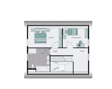 Die Flurbereiche von Erd- und Dachgeschoss sind mit der Treppe und einem Luftraum miteinander verbunden. Die dadurch entstehende Galerie im Dachgeschoss kann zum Beispiel für einen Schreibtisch genutzt werden.