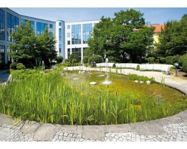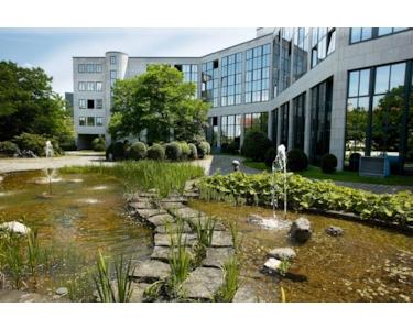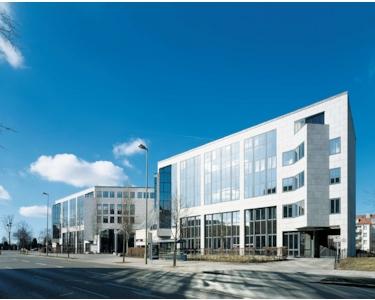 Dieser repräsentative, fünfgeschossige Bürokomplex beeindruckt mit zwei sehr anspruchsvollen Haupteingängen und einladenden Eingangsbereichen mit aufwändiger Stahlkonstruktion. Die Treppenhäuser sind mit viel Granit und Edelstahl gestaltet und verfügen jeweils über drei große Personenaufzüge. Großzügige Grüngürtel und attraktiv bepflanzte Innenhöfe mit einer Teichlandschaft laden zu kreativen Pausen ein. Die funktionalen, hellen Büroflächen werden nach Mieterwunsch renoviert und bieten: CAT 5-Verkabelung, Hohlraumboden mit Bodentanks / Fensterkanälen, Be- und Entlüftung, außenliegenden Sonnenschutz, hochwertige Bodenbeläge, Küche und getrennte WCs. TG-Plätze à € 80,00 sowie Lager- und Archivflächen à € 8,00 sind anmietbar.