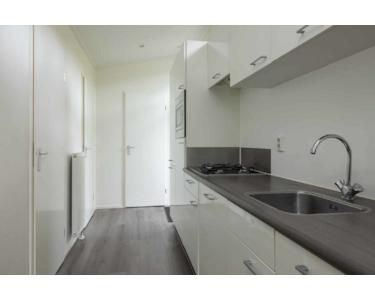 In het hart van de woning bevindt zich de keuken. De open keuken is neutraal afgewerkt en voorzien van moderne inbouwapparatuur (zoals een koelkast, vaatwasser en combinatieoven met magnetronfunctie). Het strakke design draagt bij aan een ruimtelijk gevoel in de woonkamer.