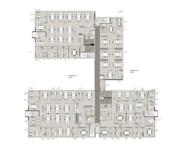 Die Aufteilung der Büroflächen lässt sich nach Bedarf vornehmen um Einzel- und Gruppenbüros, Besprechungsräume und Großraumbüros abzubilden.