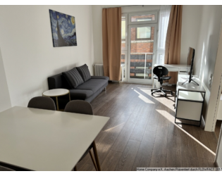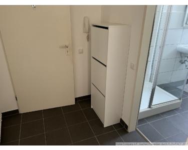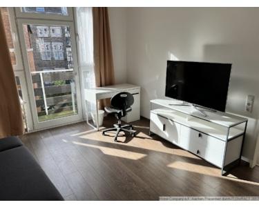 Über die Eingangsdiele betritt man das moderne und helle Bad mit Dusche, sowie das geräumige Wohnzimmer. Ein Esstisch für 4 Personen, ein bequemes Sofa, das auch kurzzeitig als Schlafsofa für einen Gast genutzt werden kann, sowie ein Arbeitstisch verteilen sich im Raum, ohne ein Gefühl der Enge aufkommen zu lassen. Durch die bodentiefe Fenstertür schweift der Blick über den eigenen kleinen Balkon zu den pittoresken Häusern der ruhigen Wohnstraße.