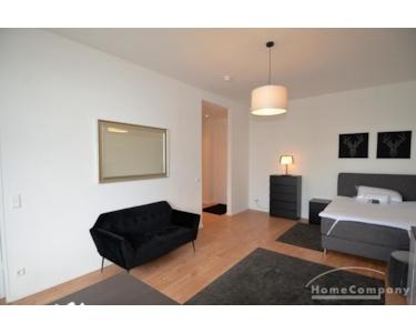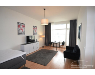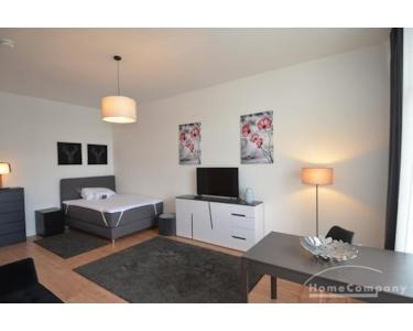 Ein-Zimmer-Wohnung in Mitte. Vollständig möbliert mit Bett, Tisch und Waschmaschine. Modern gefliestes Badezimmer mit Dusche. Im Flur befindet sich der Kleiderschrank.