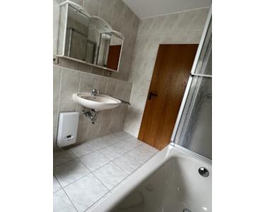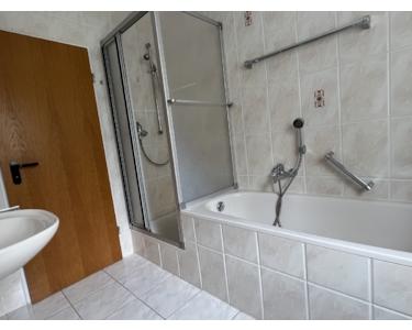 Gegenüber vom Eingang befindet sich das zeitlos ausgestattete Badezimmer mit Dusche, Badewanne und Tageslichtfenster.