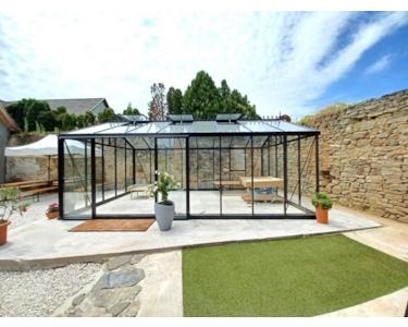 24 qm Gewächshaus vom Typ Helios Master, hergestellt in Belgien. Seitenwände aus gehärtetem Glas, Dach aus gehärtetem Glas, pulverbeschichteter Aluminiumrahmen.