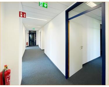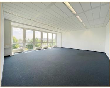 Die Beleuchtung erfolgt über moderne Bürolampen, die für eine optimale Ausleuchtung sorgen. Die Fenster sind doppelt verglast, sodass eine ruhige Arbeitsumgebung gewährleistet ist.