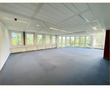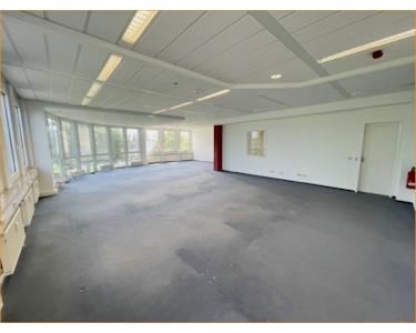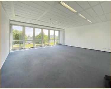 Die Beleuchtung erfolgt über moderne Bürolampen, die für eine optimale Ausleuchtung sorgen. Die Fenster sind doppelt verglast, sodass eine ruhige Arbeitsumgebung gewährleistet ist.