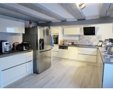 - moderne Einbauküche (Hochglanz Magnolie) inkl. Geräte & separatem Kühlschrank