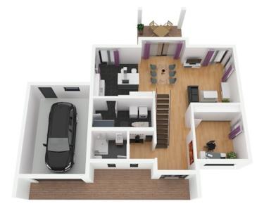Das Fertighaus Köln bietet durch die offene Gestaltung mit einer Galerie, ein exklusives Wohnraumgefühl mit viel Platz für die ganze Familie. Im Erdgeschoss des Energiesparhauses befindet sich der offen gestaltete Wohn-/Essbereich mit Küche, ein Arbeitszimmer, ein Duschbad und ein Hauswirtschafts-/und Technikraum. Der Haustechnikraum ist direkt neben der Garage angesiedelt und kann auch durch die Garage betreten werden. Das bietet im täglichen Ablauf viele Vorteile, denn die Einkäufe oder z. B. schmutzige Sportbekleidung können gleich im Hauswirtschafts- und Technikraum verbleiben. Beim Hauseingang ist ein separater Bereich für die Garderobe vorgesehen. Sechs große Terrassentüren öffnen den Wohnbereich zur überdachten Terrasse und zum Garten hin.