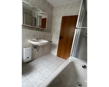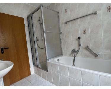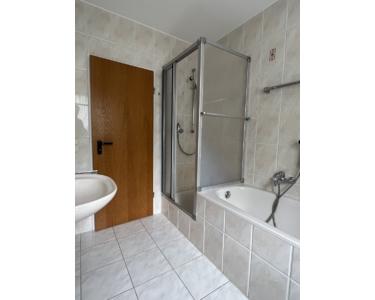 Gegenüber vom Eingang befindet sich das zeitlos ausgestattete Badezimmer mit Dusche, Badewanne und Tageslichtfenster.
