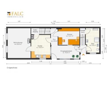 Im Erdgeschoss des Hauses befindet sich das Wohnzimmer, eine große Küche, ein Zimmer, der Flur sowie das Bad des Hauses. Das Obergeschoss ist aktuell in zwei Bereiche aufgeteilt. Hier befinden sich drei weitere Zimmer. Die Immobilie ist teilunterkellert im Bereich der Küche, mit einem Luftschutzkeller welcher als Versorgungskeller dient.