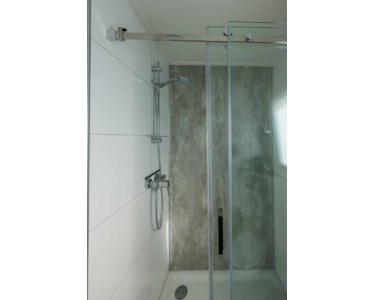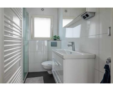 Auch im komplett gefliesten Badezimmer finden Sie den modernen Stil mit neutralen Farben wieder. Das Badezimmer ist mit einem Handtuchheizkörper, einer Toilette, einem breiten Waschtisch mit Schubladen und einer großzügigen Duschkabine mit einer Glastür ausgestattet.