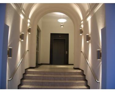 Der repräsentativ gestaltete Eingangs- und Foyerbereich mit Natursteinböden und Edelstahlelementen trägt ebenfalls zum besonderen Ambiente des Objekts bei.