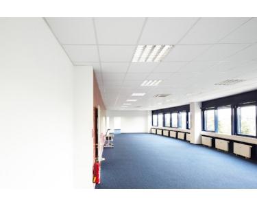 - Fensterbankkabelkanal, Teppichboden, abgehängte Decke mit integrierter Beleuchtung