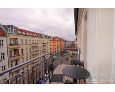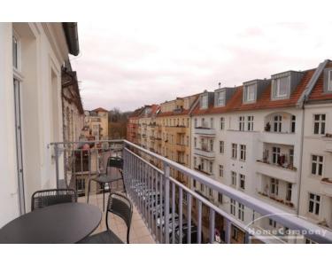 Die Wohnung hat einen großen Balkon mit einem freien Blick in den Volkspark Friedrichshain.