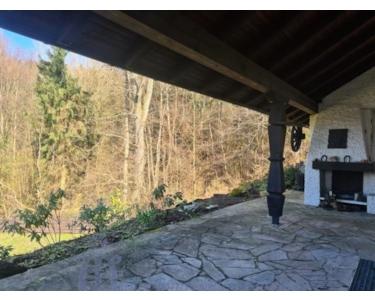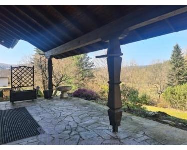 Vom Wohn-Essbereich gelangt man auf eine ca. 50 m² große in Naturstein angelegte teilweise überdachte Terrasse mit Außenkamin mit herrlichem Ausblick ins Grüne.
