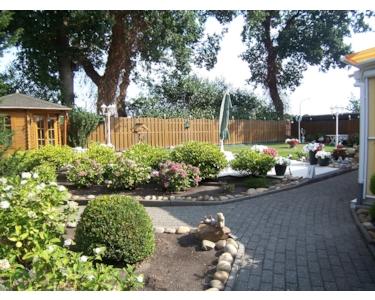 Toll angelegte Gartenanlage, komplett eingezäunt und uneinsehbar. Kleiner Wasserspiel an der Gartenterrasse, weitere Freisitzterrassen vorhanden. Das Grundstück wurde mit sehr viel Liebe zum Detail angelegt, dennoch pflegeleicht. Die Hoffläche wurde sehr großzügig bepflastertet. Kleiner Holz - Pavillon auf dem hinteren Grundstück im Kaufpreis enthalten.