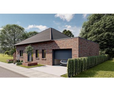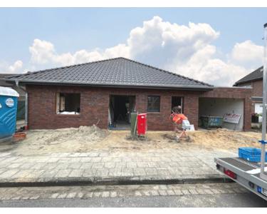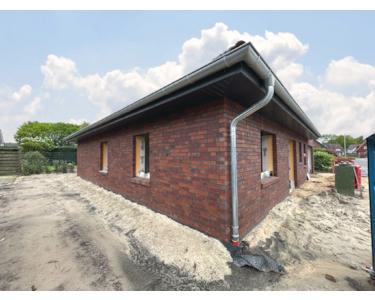 Der Walmdachbungalow wird auf einem Lückengrundstück schlüsselfertig erstellt.