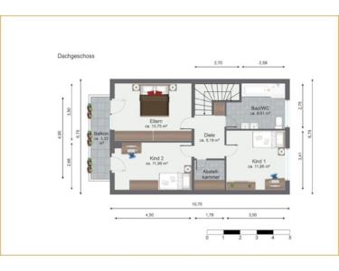 Das Dachgeschoss verfügt über drei gut geschnittene Schlafzimmer, zwei davon mit eigenem Balkonaustritt und Blick über den Garten. Ein großes Tageslichtbad mit Wanne, Dusche, Doppelwaschbecken und Bidet bietet Ihnen alle Annehmlichkeiten. Im Abstellraum sowie auf dem Spitzboden haben Sie genügend Stauraum.