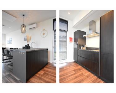 Die Küche befindet sich an der Rückwand mit einer Insel, auf der sich die Spüle und der Geschirrspüler befinden. Eine dunkle, moderne Küche, die perfekt zum Stil des Chalets passt. Wir finden auch eine Kombination aus Mikrowelle, Induktionskochfeld, Kühlschrank und Gefrierschrank mit 3 Schubladen. Alle Geräte sind von Zanussi.