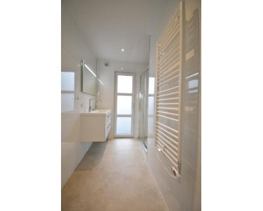 Gepflegtes Bad mit einem Waschbecken mit Schrank und einem Spiegel darüber. Hängende Toilette, Duschkabine und ein Design-Heizkörper. In diesem Raum gibt es eine elektrische Belüftung.
